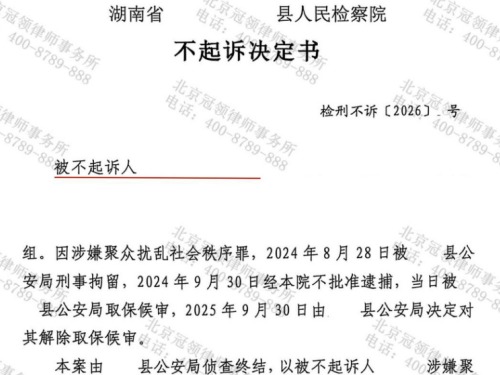 2026年1月,湖南省怀化市某县人民检察院就村民涉嫌聚众扰乱社会秩序一案作出不起诉决定。这起案件通过冠领律师的代理,成功 【查看全文】