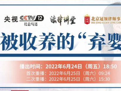 由北京冠领律师事务所主任周旭亮律师主讲的《法律讲堂——被收养的“弃婴”》,于6月24日18:50在中央电视台CCTV-1 【查看全文】