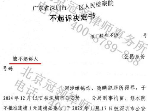 冠领律师代理广东深圳涉嫌掩隐罪案论证情节轻微助嫌疑人获不起诉...